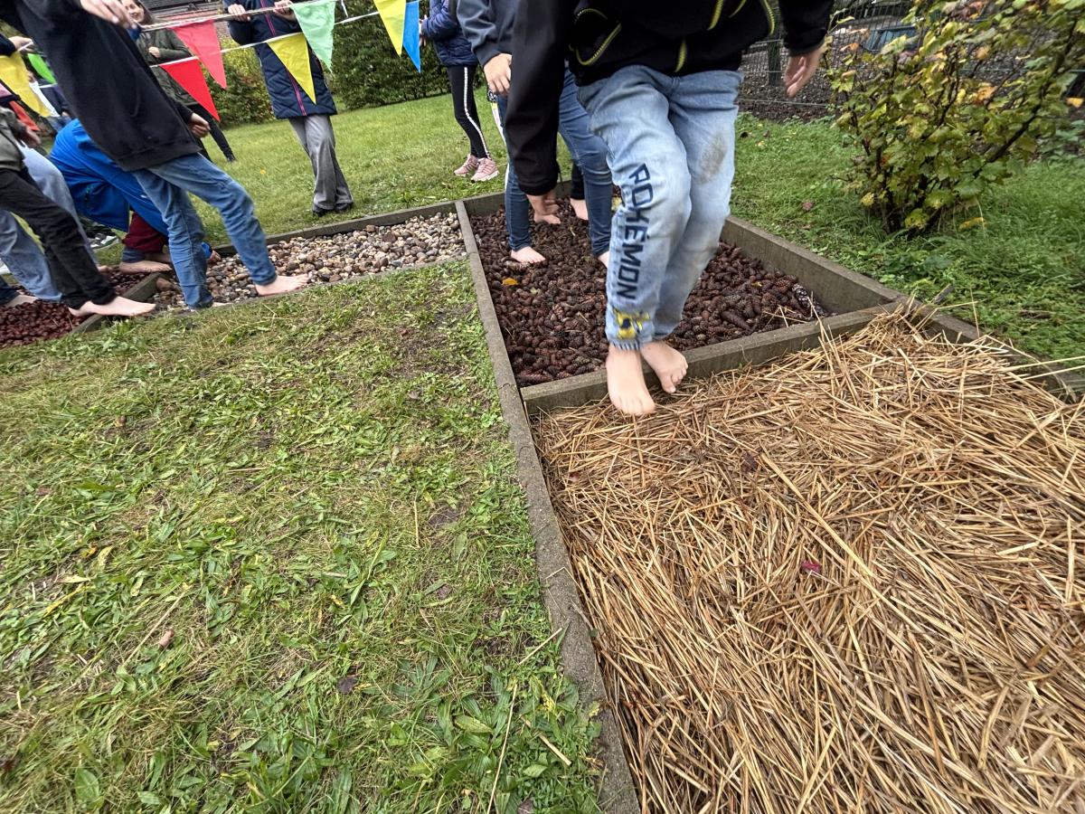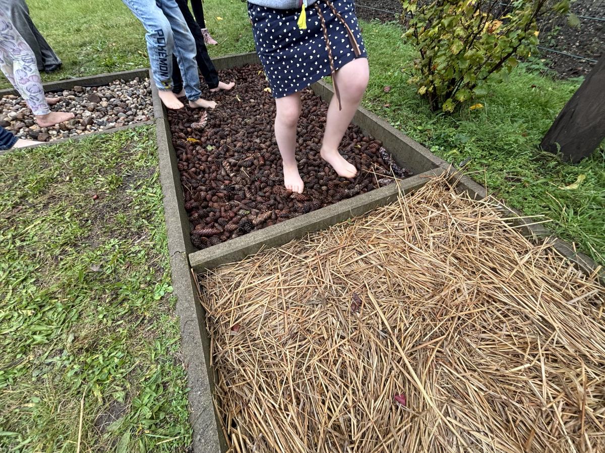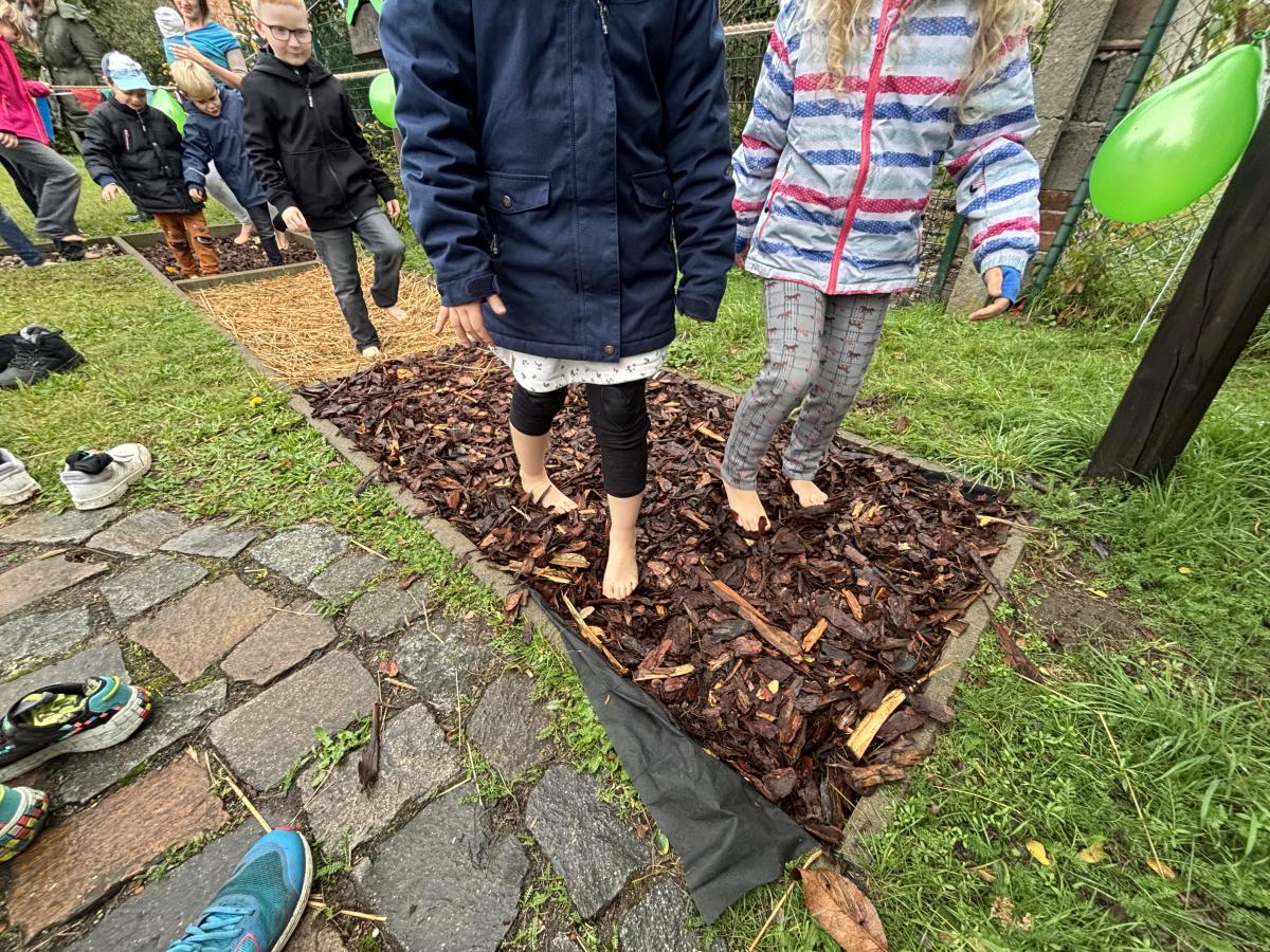 Viele Eltern haben sich aktiv an der Neugestaltung beteiligt. Sie haben Materialien besorgt, die für die verschiedenen Abschnitte des Barfußpfades benötigt wurden. Gemeinsam haben wir neue Elemente wie Kies, Rindenmulch und Stroh eingebaut, die den Kindern ein abwechslungsreiches Lauferlebnis bieten. Die Zusammenarbeit und der Gemeinschaftsgeist waren beeindruckend und haben den Tag zu einem unvergesslichen Erlebnis gemacht.